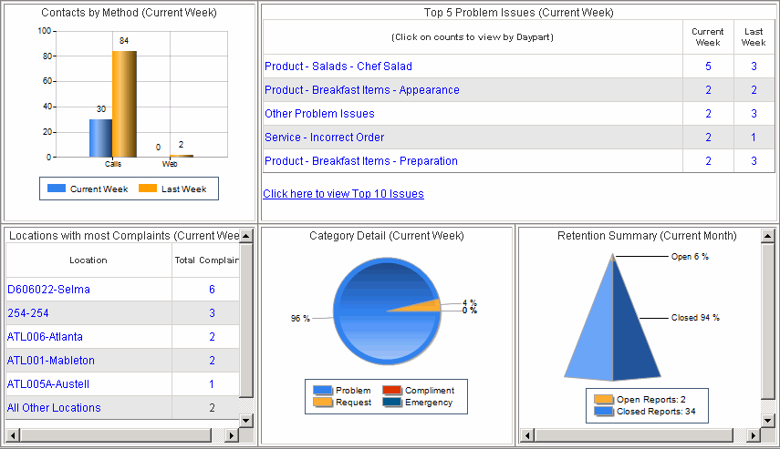 The reports in the dashboard are customizable for your needs. There are five frames available for you to display your reports. The reports may be displayed in a grid or graph format.